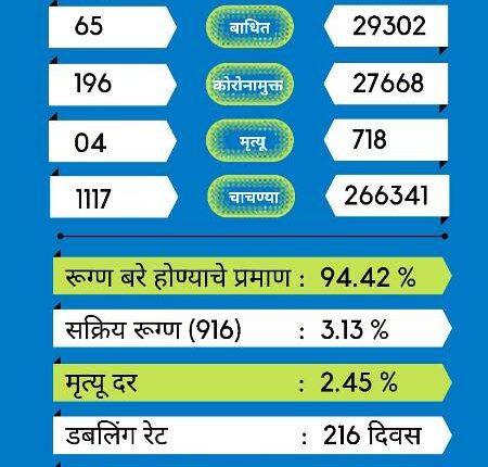 तसेच सद्या 916 सक्रिय कोरोना बाधितांवर उपचार सुरू आहेत. आत्तापर्यंत जिल्हयात एकुण 718 जणांचा मृत्यू कोरोनामुळे झाल्याची नोंद आहे. आज 4 नवीन मृत्यूमध्ये रा.कुरुड ता. वडसा जि. गडचिरोली येथील 65 वर्षीय पुरुष,रा.निलमगुडां ता. अहेरी जि. गडचिरोली येथील 65वर्षीय महिला, रा. कालीनगर ता. मुलचेरा जि. गडचिरोली येथील 65 वर्षीय महिला रा.रानमुल जि.गडचिरोली येथील 44वर्षीय पुरुष यांचा नवीन मृत्यूमध्ये समावेश आहे. यामूळे जिल्हयातील कोरोना रूग्ण बरे होण्याचे प्रमाण 94.42 टक्के, सक्रिय रूग्णांचे प्रमाण 3.13 टक्के तर मृत्यू दर 2.45 टक्के झाला.
