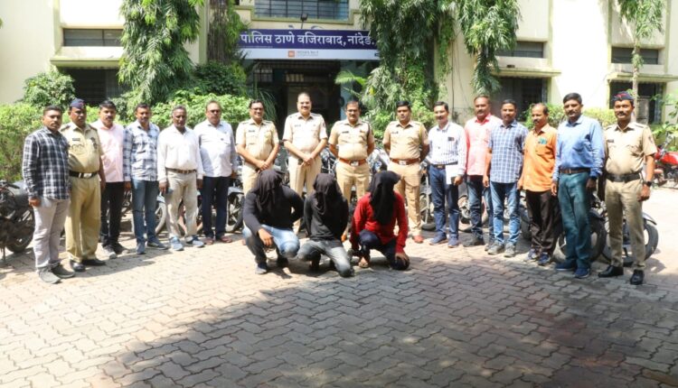 नांदेड, 19,ऑक्टोबर :- वजीराबाद गुन्हे शोध पथकाकडून चोरीच्या 30 मोटरसायकली जप्त करण्यात आल्या असून 21,80,000 रूपयांचा मुद्देमाल जप्त करण्यात आला. 3 आरोपींना अटक करण्यात आली आहे. आरोपींमध्ये शेख अरबाज उर्फ कोबरा शेख चाॅद रा. दर्गारोड पारवागेट परभणी, आरेज खाॅंन उर्फ आमेर पिता अयुब खाॅंन रा. मोठा मारोती देशमुख गल्ली परभणी, मोहम्मद मुक्तदीर उर्फ मुक्का मोहम्मद अथर रा. शाही मज्जीद, स्टेडीअम रोड परभणी चा समावेश आहे.