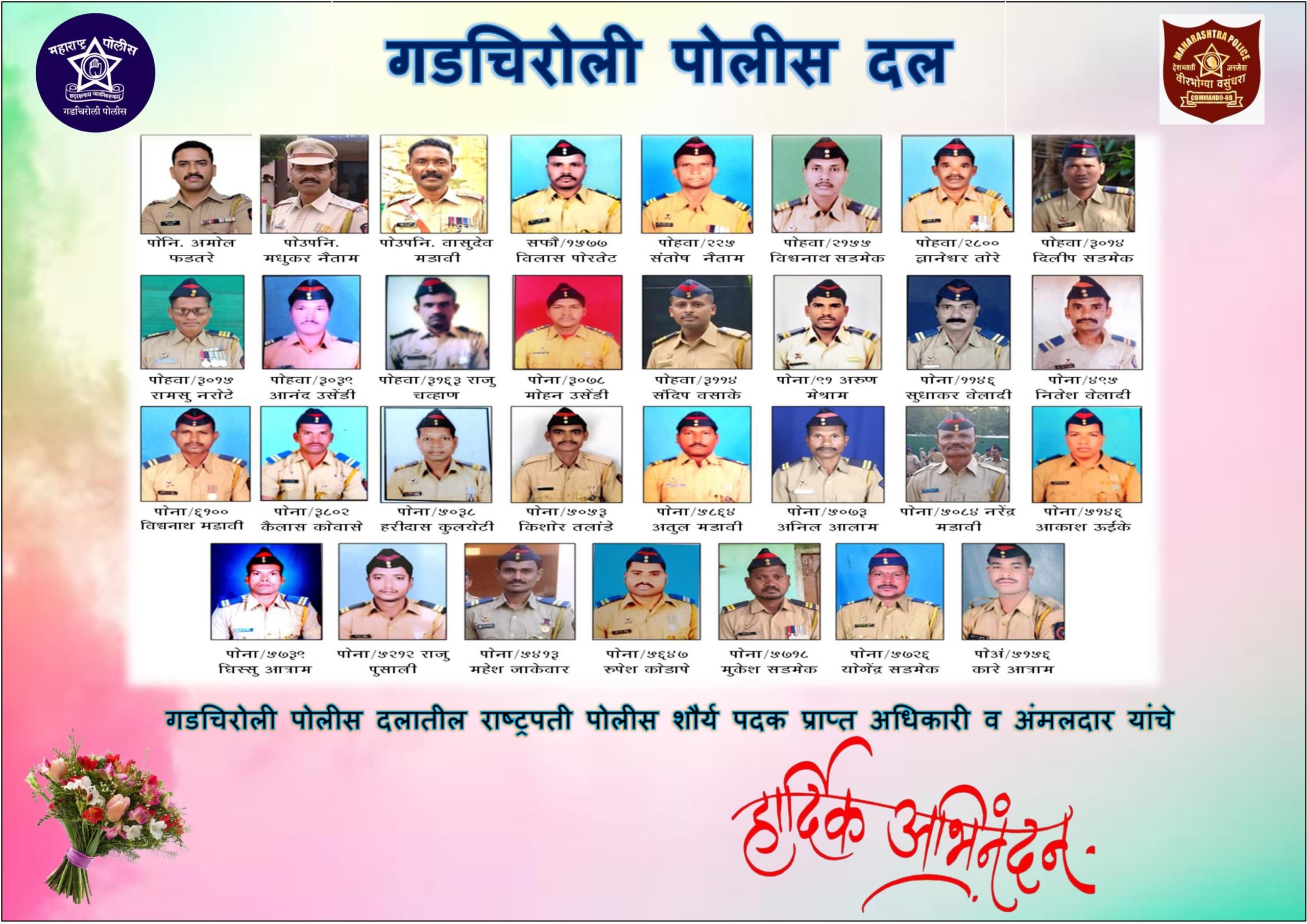 या गौरवशाली कामगिरीबद्दल पोलीस शौर्य पदक व पदोन्नती प्राप्त सर्व अधिकारी-अंमलदारांचे पोलीस अधीक्षक नीलोत्पल, अपर पोलीस अधीक्षक (अभियान) एम. रमेश, अपर पोलीस अधीक्षक अहेरी कार्तिक मधीरा आणि अपर पोलीस अधीक्षक (प्रशासन) गोकुलराज जी. यांनी मनःपूर्वक अभिनंदन केले असून, पुढील सेवेसाठी शुभेच्छा दिल्या आहेत.