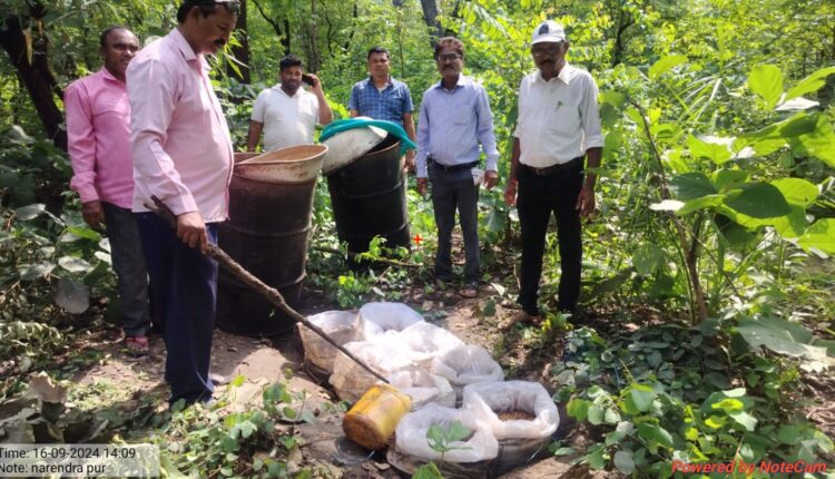 गडचिरोली : चामोर्शी तालुक्यातील नरेंद्रपुर येथील दारू विक्रेत्यांना धडा शिकवण्यासाठी नुकतेच घोट पोलीस, वनविभाग, ग्रामपंचायत समिती, गाव संघटना व मुक्तीपने जंगलपरिसरातील चार दारू भट्ट्या उध्वस्त केल्या. घटनास्थळावरून ४७ बोरी मोह सडवा व ८ लोखंडी ड्रम असा एकूण ४ लाख ६ हजार रुपये किमतीचा मुद्देमाल नष्ट करीत दोन जणांवर गुन्हा दाखल करण्यात आला आहे.