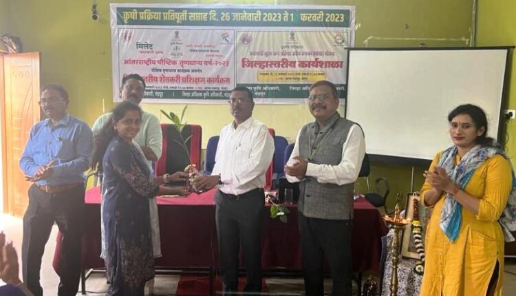 चंद्रपूर, दि. 2 फेब्रुवारी : प्रधानमंत्री सूक्ष्म अन्न प्रक्रिया उन्नयन योजनेअंतर्गत कृषी प्रक्रिया प्रतिपूर्ती सप्ताह निमित्त एक दिवसीय कार्यशाळेचे आयोजन जिल्हा अधिक्षक कृषि अधिकारी भाऊसाहेब ब-हाटे यांच्या अध्यक्षतेखाली करण्यात आले.
