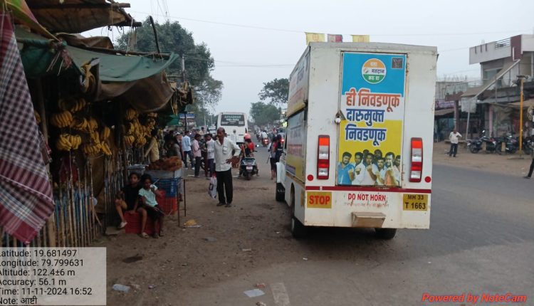गडचिरोली जिल्ह्यातील तिन्ही विधानसभा क्षेत्रात होऊ घातलेली निवडणूक ही दारूमुक्त व्हावी, यासाठी जिल्हा प्रशासनाच्या स्वीप कार्यक्रमा अंतर्गत मुक्तिपथतर्फे विविध उपक्रमाच्या माध्यमातून जाणीव-जागृती केली जात आहे. चामोर्शी तालुक्यातील शहरासह विविध गावांतील मुख्य ठिकाणी व्हिडीओ व्हॅनच्या माध्यमातून लोकांना दारूमुक्त निवडणुकीचा संदेश दिले जात आहे.