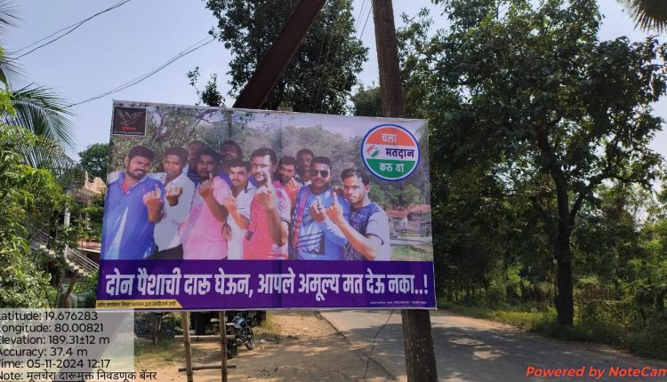 गडचिरोली : गडचिरोली जिल्ह्यातील तिन्ही विधानसभा क्षेत्रात होऊ घातलेली निवडणूक ही दारूमुक्त व्हावी, यासाठी जिल्हा प्रशासनाच्या स्वीप कार्यक्रमाअंतर्गत मुक्तिपथ-शक्तीपथ संघटनेच्या माध्यमातून जिल्हाभरातील शहरी तसेच ग्रामीण भागामध्ये बॅनर व पत्रकांतुन ही विधानसभा निवडणूक दारूमुक्त करण्याचे आवाहन केले जात आहे.