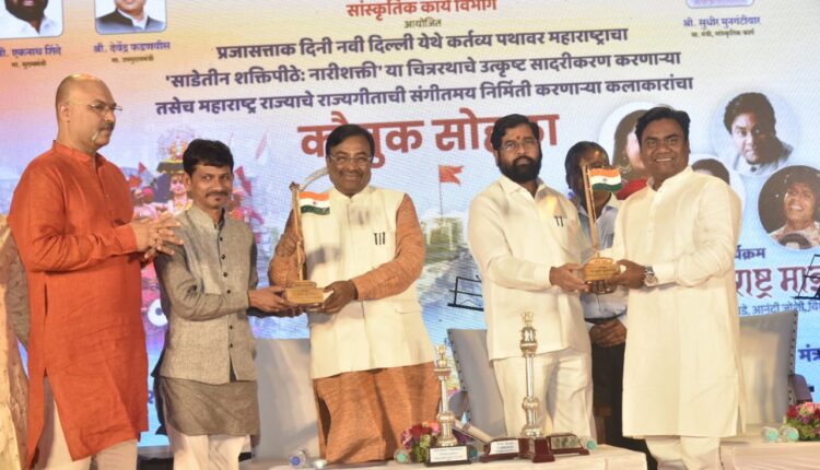 मुंबई, दि. 21 मार्च :-भारतीय प्रजासत्ताक दिनाच्या वर्धापन दिनानिमित्त नवी दिल्लीत कर्तव्य पथावर होणाऱ्या संचलनात कलावंतांनी कमी कालावधीत उत्कृष्ट कामगिरी सादर करीत द्वितीय क्रमांक पटकावला. ही महाराष्ट्रासाठी गौरवाची बाब असून या चित्ररथाच्या सादरीकरणात सहभागी कलावंत कौतुकास पात्र आहेत, असे गौरवोद्गार मुख्यमंत्री एकनाथ शिंदे यांनी काढले. राज्य शासनाच्या सांस्कृतिक कार्य विभागातर्फे प्रजासत्ताक दिनानिमित्त नवी दिल्ली येथील कर्तव्य पथावर राज्याचा ‘साडेतीन शक्तिपीठे : नारीशक्ती’ या चित्ररथाचे उत्कृष्ट सादरीकरण करणाऱ्या तसेच राज्यगीताची संगीतमय निर्मिती करणाऱ्या कलावंतांचा सत्कार सोहळा आज मंत्रालयातील त्रिमूर्ती प्रांगणात आयोजित करण्यात आला होता. त्यावेळी ते बोलत होते. यावेळी सांस्कृतिक कार्य मंत्री सुधीर मुनगंटीवार, सांस्कृतिक कार्य विभागाचे प्रधान सचिव विकास खारगे आदी उपस्थित होते. यावेळी मान्यवरांच्या हस्ते चित्ररथ निर्मिती कलावंत, चित्ररथाबरोबर नृत्य करणारे कलांवत, राज्यगीताचे कलांवत आणि महाराष्ट्र वाद्य गीत सादर करणारे गायक नंदेश उमप, गायिका वैशाली सामंत, वैशाली माडे, कौशल इनामदार, कमलेश भडकमकर, प्राची गडकरी, पंकज इंगळे, आनंदी जोशी, विशाल भांगे आदींचा सत्कार करण्यात आला. यानिमित्त ‘जय जय महाराष्ट्र माझा’ हा सांस्कृतिक कार्यक्रम आयोजित करण्यात आला होता.