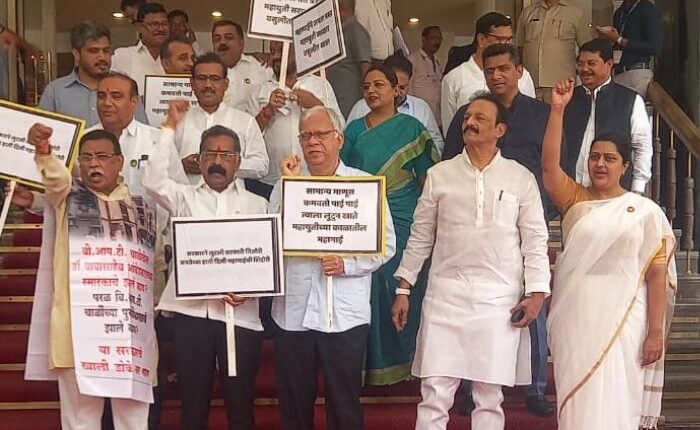 मुंबई, 05 जुले – राज्यात वाढलेल्या महागाईच्या विरोधात पावसाळीअधिवेशनाच्या आठव्या दिवशी विधिमंडळ परिसरात महाविकास आघाडी आक्रमक झाली. विरोधी पक्षाच्या आमदारांनी ‘सामान्य माणूस कमवतो पाई पाई, त्याला लुटून खाते महायुतीच्या काळातील महागाई’, ‘सरकारने लुटली सरकारी तिजोरी जनतेच्या हाती दिली महागाईची शिदोरी’ अशा गगनभेदी घोषणा देत सरकारच्या विरोधात जोरदार निदर्शने केली.