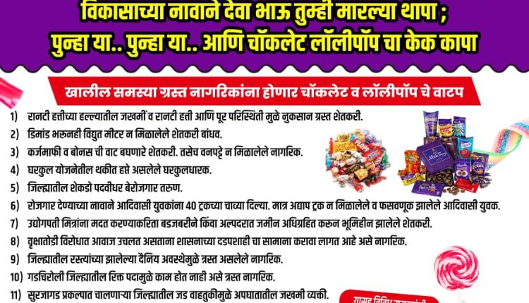 गडचिरोली : राज्याचे मुख्यमंत्री आणि गडचिरोली जिल्ह्याचे पालकमंत्री देवेंद्र फडणवीस यांच्या वाढदिवसानिमित्त काँग्रेसने केलेली घोषणा आता राज्यभर चर्चेचा विषय ठरत आहे. २२ जुलै रोजी गडचिरोली काँग्रेस कार्यालयासमोर “लॉलीपॉप आणि चॉकलेट वाटप आंदोलन” राबवून, जिल्ह्यातील ज्वलंत प्रश्नांकडे शासनाचे लक्ष वेधण्यात येणार आहे. हा कार्यक्रम फक्त विरोधासाठीचा विरोध नसून, जिल्ह्यातील खोलवर रुजलेल्या असंतोषाचे दृश्य प्रतिनिधित्व ठरणार आहे.