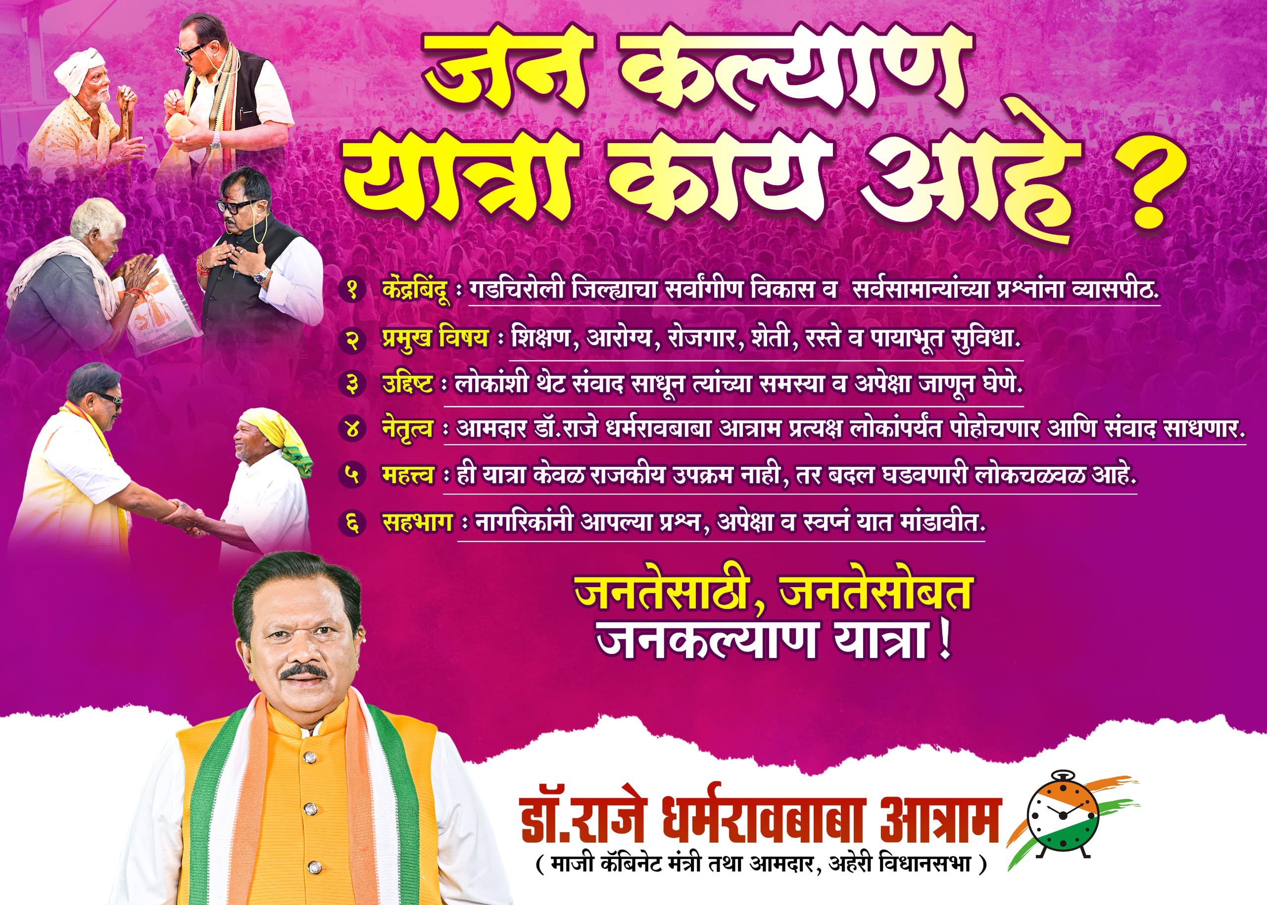 १२ ऑक्टोबर रोजी चामोर्शी येथे धर्मरावबाबा ‘जनकल्याण यात्रा’च्या माध्यमातून आपले राजकीय शक्तिप्रदर्शन करणार आहेत. या सभेतून ते स्वबळावरच्या लढाईचा बिगुल वाजवतील, अशी चिन्हं स्पष्ट दिसू लागली आहेत. जिल्हाभरातून कार्यकर्त्यांचा आणि समर्थकांचा मोठा जनसागर या सभेत जमणार असल्याची चर्चा आहे.