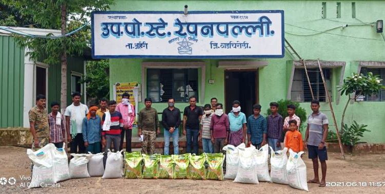 अहेरी : आज दि 18 जून 2021 रोजी पोलिस प्रशासन गडचिरोली व उप पोलिस स्टेशन रेपनपल्ली येथे यांचे संयुक्त विद्यमाने उप पोलिस स्टेशन रेपनपल्ली येथे शेतकऱ्यांना वेगवेगळ्या धान बियानाचे वाटप करण्यात आले.