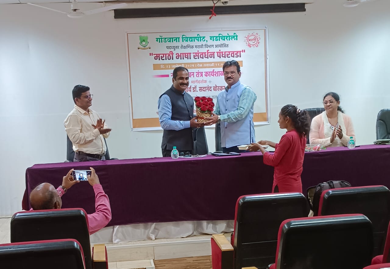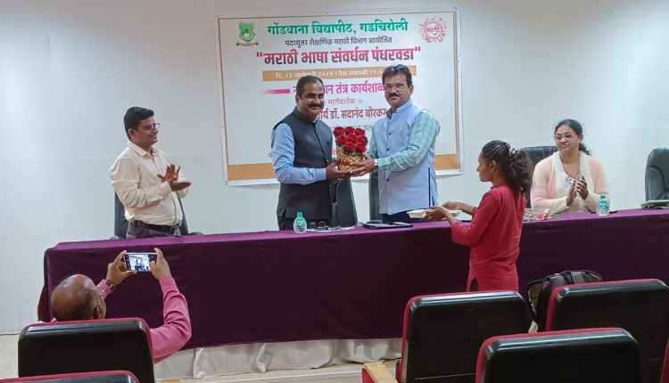 गडचिरोली : गोंडवाना विद्यापीठ गडचिरोली येथील पदव्युत्तर शैक्षणिक मराठी विभागात कुलगुरू डॉ.प्रशांत बोकारे यांच्या मार्गदर्शनाखाली भाषा संवर्धन पंधरवडा आयोजित केला. त्या निमित्त नाट्यतंत्र लेखन कार्यशाळा काल आयोजित केली. या कार्यशाळेकरिता मार्गदर्शक सुप्रसिद्ध नाट्यलेखक, प्राचार्य डॉ. सदानंद बोरकर होते. यावेळी बोलताना ते म्हणाले की, नाटकाची भाषा लेखकाच्या विचाराला आकार देणारी ठरते असे सांगून आपल्या नाट्य लेखन निर्मितीचे अनुभव विश्व विद्यार्थ्यांसमोर उलगडले.