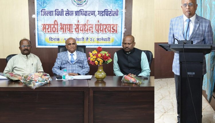 गडचिरोली – मराठी भाषा ही संत ज्ञानेश्वर, तुकाराम आणि समर्थ रामदास यांची भाषा असून तिचा अभिमान प्रत्येकाने बाळगावा, असे प्रतिपादन गडचिरोली जिल्हा न्यायालयात आयोजित “मराठी भाषा संवर्धन पंधरवाडा” निमित्त प्रमुख जिल्हा व सत्र न्यायाधीश वसंत भा. कुलकर्णी यांनी केले.