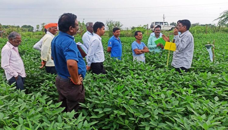 जिल्हा अधिक्षक कृषी अधिकारी शंकर तोटावार, कृषी विज्ञान केंद्र सिंदेवाही येथील शास्त्रज्ञ डॉ. विनोद नागदेवते, वरोराचे उपविभागीय कृषी अधिकारी तथा तालुका कृषि अधिकारी सुशांत लव्हटे, मंडळ कृषि अधिकारी प्रगती चव्हाण, कृषि पर्यवेक्षक किशोर डोंगरकार व श्री गणेश ईढोळे यांनी वरोरा तालुक्यांतील शेगांव (बु.) येथील शेतकरी रविंद्र हरी साखरकर, मौजा मोखाळा येथील प्रशांत खिरटकर व बबलू खिरटकर यांच्या शेतातील वाण केडीएस-726, फुले संगम, फुले दुर्वा, पिडीकेवि-अंबा या वाणांची पाहणी करून सोयाबिन पिकावरील किड व पिवळा मोझॅकबाबत शेतकऱ्यांना मार्गदर्शन केले. त्यांनतर खेमजई येथील शेतकरी चंद्रहास मोरे यांच्या शेतातील सोयाबीन पिकवाण केडीएस-726 ची पाहणी करून व्यवस्थापनाविषयी मार्गदर्शन केले.