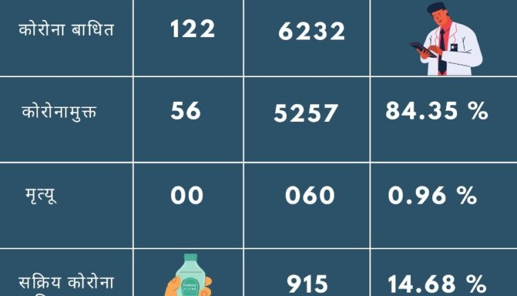 गडचिरोली, दि.4 : कोरोनाचे जिल्हयात 122 नवीन बाधित आढळून आले. तसेच आज 56 जणांनी कोरोनावर मात केल्याने त्यांना रूग्णालयातून घरी सोडण्यात आले. यामुळे जिल्हयातील आत्तापर्यंत बाधित 6232 पैकी कोरोनामुक्त झालेली संख्या 5257 वर पोहचली. तसेच सद्या 915 सक्रिय कोरोना बाधितांवर उपचार सुरू आहेत. आत्तापर्यंत जिल्हयात एकुण 60 जणांचा मृत्यू कोरोनामुळे झाल्याची नोंद आहे. आज जिल्हयातील कोरोना रूग्ण बरे होण्याचे प्रमाण 84.35 टक्के, सक्रिय रूग्णांचे प्रमाण 14.68 टक्के तर मृत्यू दर 0.96 टक्के झाला.