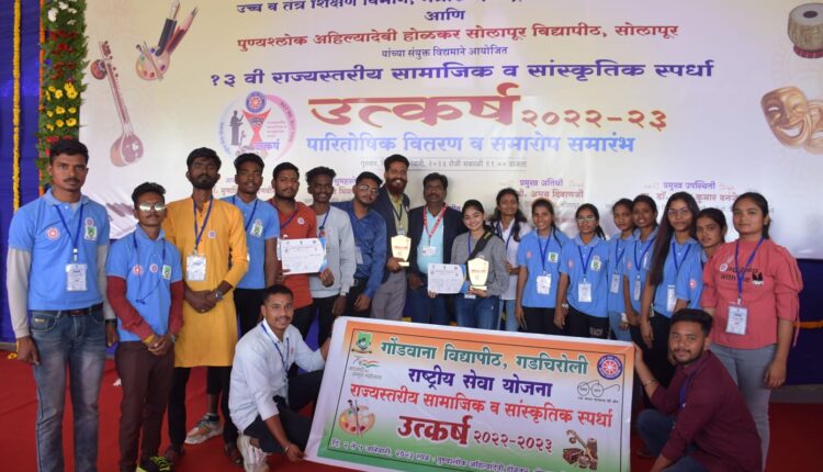 गडचिरोली, दि. ६ जानेवारी : उच्च व तंत्र शिक्षण विभाग, मंत्रालय, राष्ट्रीय सेवा योजना कक्ष आणि पुण्यश्लोक अहिल्यादेवी होळकर सोलापूर विद्यापीठ सोलापूर यांच्या सयुंक्त विद्यमाने आयोजित राज्यस्तरीय सामाजिक व सांस्कृतिक स्पर्धा उत्कर्ष २०२२-२३ नुकतीच सोलापूर येथे दिनांक २ जानेवारी ते ५ जानेवारी दरम्यान पार पडली. या स्पर्धेत छायाचित्रण आणि उत्कर्ष कार्यप्रसिद्धी अहवाल यासाठी गोंडवाना विद्यापीठाच्या स्वंयसेवकांनी तृतीय क्रमांक पटकावत गोंडवाना विद्यापीठाच्या शिरपेचात मानाचा तुरा रोवल्या गेलाय.