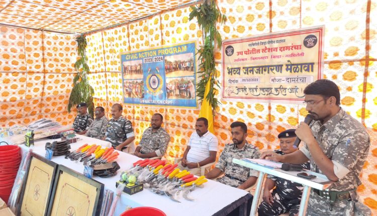 दामरंचा : उप पोलीस स्टेशन दामरंचा येथे दि. २० डिसेंबर २०२३ रोजी पोलीस अधिक्षक निलोत्पल, अपर पोलीस अधिक्षक कुमार चिंता अपर पोलीस यतीश देशमुख. अपर पोलीस अधिक्षक एम.रमेश यांच्या संकल्पनेतून तसेच उप विभागीय पोलीस अधिकारी सुजितकुमार क्षीरसगर यांच्या मार्गदर्शनाखाली व सीआरपीएफ “जी” कंपनी ९ बटालियन यांच्या सहकार्याने उप पोस्टे दामरंचा येथे भव्य जनजागरण मेळावा घेण्यात आला .