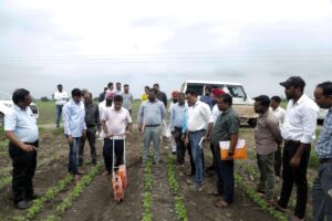 यावेळी जिल्हा अधीक्षक कृषी अधिकारी शंकर तोटावार यांनी सोयाबीन लागवडीच्या तंत्रज्ञानाबद्दल माहिती देऊन शेतकऱ्यांच्या उत्पादनात वाढ करण्यासाठी सोयाबीन पिकाच्या अष्टसूत्रीचा वापर फायदेशीर असल्याचे सांगितले. सोयाबिन पिकावर पुढे येणाऱ्या किडी व रोगापासून संरक्षण करण्यासाठी पिकाच्या पेरणी नंतर 15 दिवसानंतर चिकट सापळे, कामगंध सापळे, पक्षी थांबे, निंबोळी अर्क व दशपर्णी अर्काचा वापर करावा. तसेच खत व्यवस्थापन करताना १२:६१:०० हे खत १०० ग्रॅम अधिक चिलेटेड सुक्ष्म मुलद्रव्य २० ग्रॅमप्रती १० लिटर पाणी या प्रमाणात वापर करण्याबाबत सुचना देण्यात आल्या.