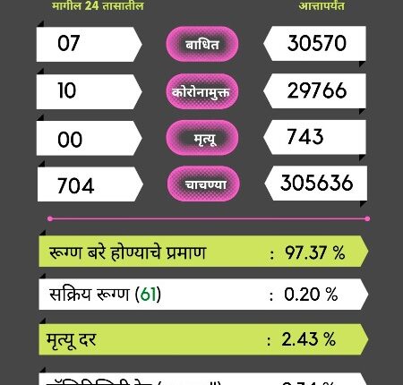 तर आज कोरोनामुक्त झालेल्या 10 रूग्णांमध्ये गडचिरोली मधील 02, अहेरी 00, आरमोरी 00, भामरागड 00, चामोर्शी 00, धानोरा 00, एटापल्ली 00, मुलचेरा 07, सिरोंचा 01, कोरची 00, कुरखेडा 00 तसेच वडसा येथील 00 जणांचा समावेश आहे.