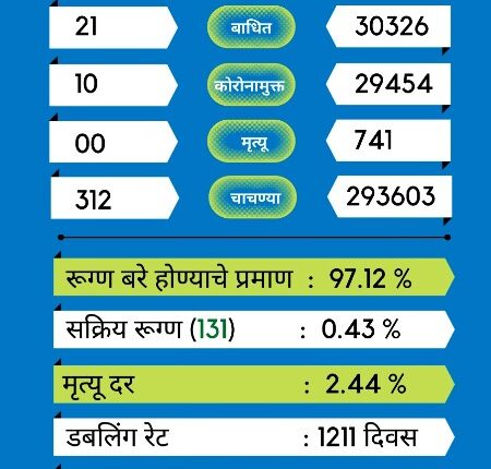 आत्तापर्यंत जिल्हयात एकुण 741 जणांचा मृत्यू कोरोनामुळे झाल्याची नोंद आहे. यामूळे जिल्हयातील कोरोना रूग्ण बरे होण्याचे प्रमाण 97.12 टक्के, सक्रिय रूग्णांचे प्रमाण 0.43 टक्के तर मृत्यू दर 2.44 टक्के झाला.