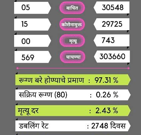 आत्तापर्यंत जिल्हयात एकुण 743 जणांचा मृत्यू कोरोनामुळे झाल्याची नोंद आहे. यामूळे जिल्हयातील कोरोना रूग्ण बरे होण्याचे प्रमाण 97.31 टक्के, सक्रिय रूग्णांचे प्रमाण 0.26 टक्के तर मृत्यू दर 2.43 टक्के झाला.
