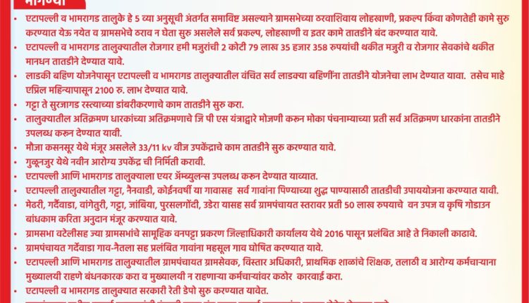एटापल्ली व भामरागड तालुके हे 5 व्या अनुसूची अंतर्गत समाविष्ट असल्याने ग्रामसभेच्या ठरवाशिवाय लोहखाणी, प्रकल्प किंवा कोणतेही कामे सुरु करण्यात येऊ नयेत व ग्रामसभेचे ठराव न घेता सुरु असलेले सर्व प्रकल्प, लोहखाणी व इतर कामे तातडीने बंद करण्यात यावे. एटापल्ली व भामरागड तालुक्यातील रोजगार हमी मजुरांची 2 कोटी 79 लाख 35 हजार 358 रुपयांची थकीत मजुरी व रोजगार सेवकांचे थकीत मानधन तातडीने देण्यात यावे. लाडकी बहिण योजनेपासून एटापल्ली व भामरागड तालुक्यातील वंचित सर्व लाडक्या बहिणींना तातडीने योजनेचा लाभ देण्यात यावा. तसेच माहे एप्रिल महिन्यापासून 2100 रु. लाभ देण्यात यावे. गट्टा ते सुरजागड रस्त्याच्या डांबरीकरणाचे काम तातडीने सुरु करा. तालुक्यातील अतिक्रमण धारकांच्या अतिक्रमणाचे जिपीएस यंत्राद्वारे मोजणी करून मोका पंचनाम्याच्या प्रती सर्व अतिक्रमण धारकांना तातडीने उपलब्ध करून देण्यात यावी.