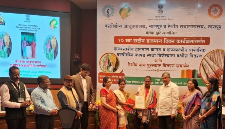 वस्त्रोद्योग विभाग आणि रेशीम संचालनालय यांच्या संयुक्त विद्यमाने नागपूर येथे 10 व्या राष्ट्रीय हातमाग दिवसाचे औचित्य साधुन सन 2022-23 यावर्षात प्रती एकरी रुपये 1 लक्ष पेक्षा जास्त उत्पन्न मिळवणाऱ्या प्रथम तीन रेशीम शेतकऱ्यांचा सपत्नीक सत्कार करण्यात आला. गडचिरोली जिल्ह्यातून प्रथम पुरस्कारासाठी सौ. लता व किशोर रामकृष्ण मेश्राम, रा. बोरीचक, द्वितीय पुरस्कारासाठी सौ. रेखा व हिरामन नक्टु डोंगवार रा. इंजेवारी, तृतीय पुरस्कारासाठी सौ. यशोदा व विलास देवराव शिवूरकार रा. देऊळगांव, ता. आरमोरी, या दाम्पत्यांचा प्रथम पुरस्कारासाठी रु.11 हजार, द्वितीय पुरस्कारासाठी रु.7500 व तृतीय पुरस्कारासाठी रु.5000 रोख रक्कम शाल, श्रीफळ, साडी आणि प्रशस्तीपत्र देऊन गौरव करण्यात आला.