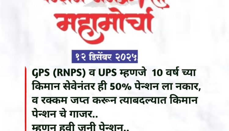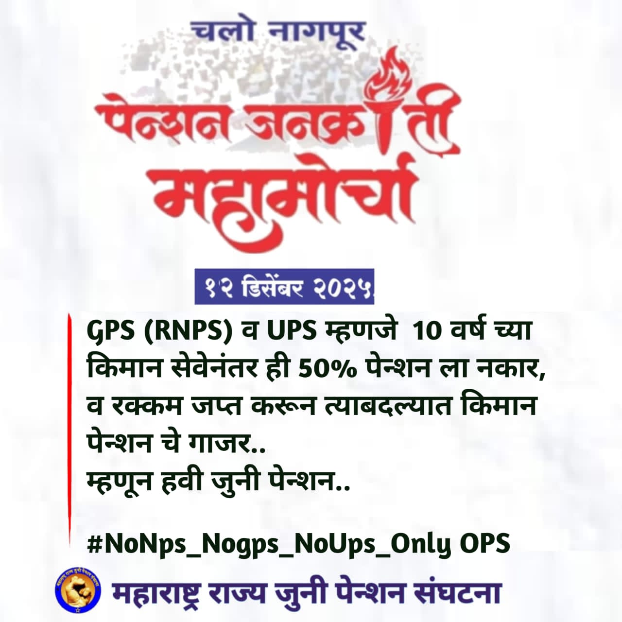 गडचिरोली : महाराष्ट्र राज्य जुनी पेन्शन संघटनेच्या आवाहनावरून राज्यातील विविध विभागांतील लाखो अधिकारी व कर्मचारी १२ डिसेंबर रोजी नागपूर येथे होणाऱ्या हिवाळी अधिवेशनावर ‘पेन्शन जनक्रांती महामोर्चा’ घेऊन धडकणार आहेत. एकमेव मागणी — १ नोव्हेंबर २००५ नंतर सेवेत रुजू झालेल्या सर्व कर्मचाऱ्यांना १९८२–८४ ची जुनी पेन्शन योजना लागू करावी.