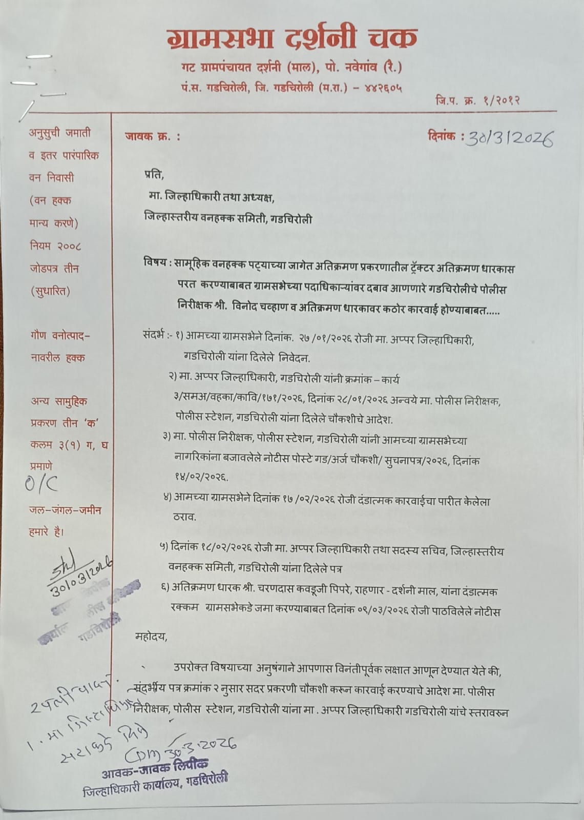 गडचिरोली, : सामूहिक वनहक्क पट्ट्याच्या क्षेत्रात अतिक्रमण केल्याप्रकरणी ग्रामसभेने ताब्यात घेतलेल्या ट्रॅक्टर प्रकरणाला आता नवे वळण लागले असून, पोलिसांकडून ट्रॅक्टर सोडण्यासाठी दबाव आणला जात असल्याचा गंभीर आरोप दर्शनीचक ग्रामसभेने केला आहे. या प्रकरणी गडचिरोली पोलीस स्टेशनचे पोलीस निरीक्षक विनोद चव्हाण यांच्यावर कठोर कारवाई करण्याची मागणी ग्रामसभेने जिल्हाधिकाऱ्यांकडे निवेदनाद्वारे केली आहे.