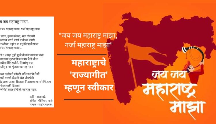 मुंबई 2 फेब्रुवारी :- स्वातंत्र्याच्या अमृत महोत्सवाचे औचित्य साधून राज्यातील तरुणाई, समाजातील सर्वच नागरिकांना स्फूर्तीदायक असणारे आणि महाराष्ट्राच्या शौर्याचे वर्णन करणारे अस्मितादर्शक ‘जय जय महाराष्ट्र माझा, गर्जा महाराष्ट्र माझा’ हे कवी राजा नीळकंठ बढे लिखित स्फूर्तीगीत राज्य शासनाने राज्याचे अधिकृत राज्यगीत म्हणून स्वीकारले असूनन याबाबतचा शासन निर्णय जारी केला आहे. या राज्यगीत गायनाबाबतची नियमावली जाहीर करण्यात आली आहे. कवीवर्य राजा बढे लिखित व शाहीर साबळे यांनी गायलेल्या गीतावर यथोचित संस्करण करून दोन चरणांसह राज्यगीत स्वीकृत करण्यात आले आहे. या गीताचा कालावधी सुमारे 1.41 मिनिटे असणार आहे. सर्व नागरिकांनी राज्यगीताच्या सन्मानपूर्वक गायन वादनामध्ये उत्स्फूर्त सहभाग नोंदविण्याचे आवाहन राज्य शासनाने केले आहे.