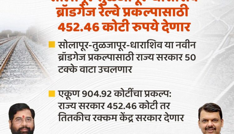 सोलापूर-तुळजापूर-उस्मानाबाद हा नवीन ब्रॉडगेज रेल्वे मार्ग फास्ट ट्रॅकवर आणण्यासाठी राज्य शासनाने आपल्या वाट्याचे ४५२ कोटी ४६ लाख रुपये आर्थिक सहभाग देण्याचा निर्णय आज झालेल्या मंत्रिमंडळ बैठकीत घेतला. बैठकीच्या अध्यक्षस्थानी मुख्यमंत्री एकनाथ शिंदे होते. या प्रकल्पासाठी ९०४ कोटी ९२ लाख इतका खर्च येणार असून ५० टक्के सहभाग राज्य शासनाचा आहे.