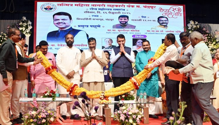 सन्मित्र महिला नागरी सहकारी बँकेच्या रौप्य महोत्सवी सोहळ्यानिमित्त प्रियदर्शनी इंदिरा सभागृह येथे आयोजित कार्यक्रमात मुख्यमंत्री श्री. फडणवीस बोलत होते. यावेळी मंचावर राज्याचे आदिवासी विकास मंत्री तथा चंद्रपूर जिल्ह्याचे पालकमंत्री डॉ. अशोक उईके, आमदार सर्वश्री सुधीर मुनगंटीवार, किशोर जोरगेवार, कीर्तिकुमार भांगडीया, करण देवतळे, देवराव भोंगळे, राष्ट्रीय मागासवर्गीय आयोगाचे अध्यक्ष हंसराज अहीर, माजी मंत्री व बँकेच्या संचालिका शोभाताई फडणवीस, अध्यक्षा डॉ. रजनी हजारे, जिल्हाधिकारी विनय गौडा, मुख्य कार्यकारी अधिकारी विवेक जॉन्सन, पोलिस अधिक्षक मुम्मका सुदर्शन, मनपा आयुक्त विपीन पालीवाल आदी उपस्थित होते.