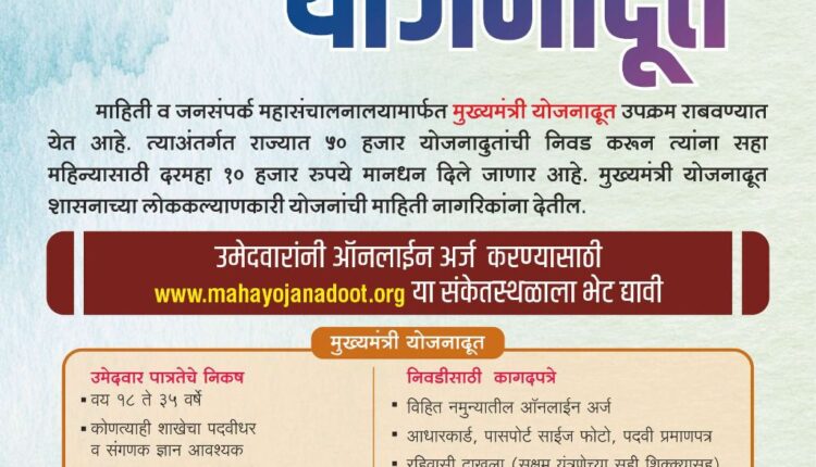 महाराष्ट्र शासनाच्या माहिती व जनसंपर्क महासंचालनालयामार्फत ‘मुख्यमंत्री योजनादूत’ उपक्रमाची अंमलबजावणी करण्यात येत आहे. प्रत्येक ग्रामपंचायत पातळीवर एक तर शहरी भागात प्रत्येक पाच हजार लोकसंख्येमागे एक अशा पद्धतीने राज्यात एकूण 50 हजार योजनादूतांची सहा महिन्यांसाठी निवड केली जाणार आहे. या योजनादूतांना दरमहा 10 हजार रूपये मानधन दिले जाणार आहे. हे योजनादूत शासनाच्या लोककल्याणकारी योजनांबाबत नागरिकांना माहिती देतील. गडचिरोली जिल्ह्यात एकूण 647 योजनादूतांची निवड करण्यात येणार आहे.