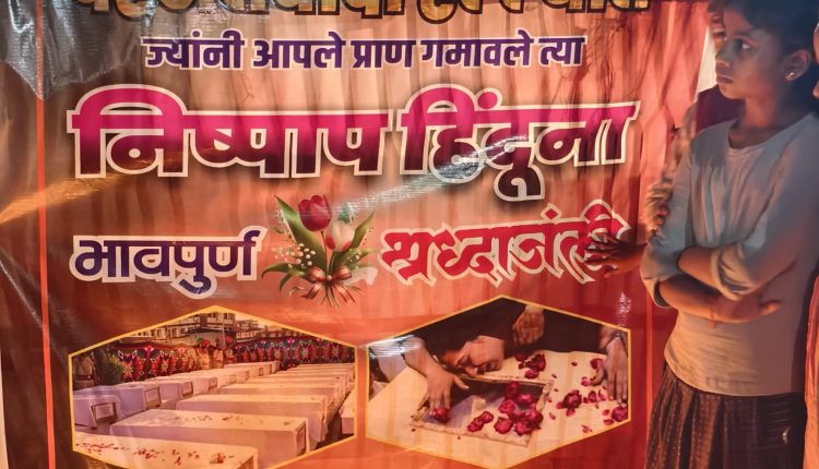 श्रद्धांजली सभेत नागरिकांनी पाकिस्तानविरोधात घोषणाबाजी करत दहशतवादाचा निषेध केला. “पाकिस्तान मुर्दाबाद”, “दहशतवाद संपवा” अशा घोषणा देत उपस्थितांनी आपल्या भावना व्यक्त केल्या. संपूर्ण देशभर या घटनेविरोधात संताप व्यक्त करण्यात येत असून, विविध सामाजिक संघटनांनी दहशतवाद्यांच्या कृत्याचा निषेध नोंदवला आहे.