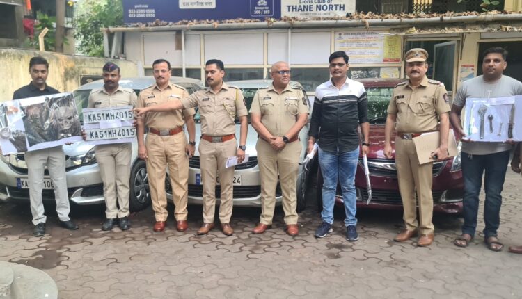 दि.१९/११/२०२२ रोजी पहाटे ०४ : ५० वा. चे सुमारास श्रीनगर पोलीस स्टेशनचे हददीत तपास पथकातील सपोउनि माणिक इंगळे, पो.शि/ ७०१८. धुत्रे, पो.शि./ २८५० शेडगे, पो. शि. १९२/साळुंखे असे साध्या वेशात खाजगी मोटार सायकलने रोड नं.१६ कडून रोड नं.१८ एस कडे रात्रगस्त फिरत असतांना रोड नं. १८ एस येथे आर. के. दत्त कन्सर्न कंपनीच्या भिंतीलगत, वागळे इस्टेट, ठाणे या ठिकाणी एक सिल्वर रंगाची होंडा मोबीलीयो व एक मरूण रंगाची स्विफ्ट डिझायर या वाहनातील इसम १) नवीन चंद्रभान सिंग, वय – २६ वर्षे, २) चंद्रकांत तिमाप्पा पुजारी, वय – ३८वर्षे ३) विश्वजीत विनोद डांगळे, वय – २३वर्षे व ४) जुबेर ५) थॉमस डॅनिय व त्यांचे सोबत असलेले दोन साथीदार हे दरोडा घालण्याचे उद्देशाने एकत्र दबा धरून असतांना त्यांना घेराव घालुन ताब्यात घेतांना १) जुबेर २) थॉमस डॅनिय व त्यांचे सोबत असलेले दोन साथीदार हे तेथुन पळुन गेले. उर्वरीत वरिल अ.नं. १ ते ३ यांना ताब्यात घेतले व त्यांचेकडील दोन चारचाकी वाहनांची झडती घेतली असता एक पांढ-या रंगाची लाल व तपकीरी रंगाची लहान फुलांची डिझाईन असलेली कापडी पिशवी मिळाली त्यात एक मोठा स्कु ड्रायव्हर, एकुण ४ कटावणी पैकी दोन अडीच फुट लांबीच्या व दोन दिड फुट लांबीच्या, एक मोठा अॅडजस्टेबल पाना व एक लहान अॅडजस्टेबल पाना, एक १०-१२ नंबरचा पट्टी पाना, एक चाकु, चिकटपट्टी, मिरची पुड, एक जोड हॅन्डग्लोज, कापडी मास्क, काळया रंगाची टोपी, वाहनाच्या दोन नंबर प्लेट KA 51 MH 4015 अश्या एकच नंबरच्या असे साहीत्य जवळ बाळगुन दरोडा घालण्याचे उद्देशाने तयारी केली असतांना मिळुन आल्याचे निष्पन्न झाल्याने सविस्तर पंचनामा करून मुद्येमाल जप्त करण्यात आला असुन आरोपीत १) नवीन चंद्रभान सिंग, वय – २६वर्षे, २) चंद्रकांत तिमाप्पा पुजारी, वय – ३८वर्षे, ३) विश्वजीत विनोद डांगळे, वय – २३वर्षे, तसेच पळुन गेलेले आरोपीत ४) जुबेर २) थॉमस डॅनियल, जुबरे सोबत आलेले दोन साथीदार यांचे विरूध्द श्रीनगर पोलीस स्टेशन गु.रं. नं. २६३ भा.द.वि. कलम ३९९ प्रमाणे दिनांक १९/११/२०२२ रोजी २६ / २०:०७ वा. गुन्हा दाखल करण्यात आला आहे.