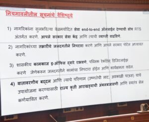 ऑनलाईन सेवा कालमर्यादेत यामध्ये एंड टू एंड ऑनलाईन सेवा कालमर्यादेत देण्याची सोय असेल. आपले सरकार सेवा केंद्र आणि त्याची व्याप्ती वाढवून नागरिकांच्या तक्रारींचे जलद गतीने निपटारा करण्यात येतील. आपले सरकार पोर्टल अद्यावत करण्यात येईल. शासकीय कामकाज ई ऑफिसद्वारे करण्यात येईल. पब्लिक रेकॉसार्वजनिक कागदपत्रांचे डिजिटायझेशन करण्यात येईल. जेणेकरून जलद गतीने कामे होतील व कार्यक्षमता वाढेल. कुठल्याही फाईलचा प्रवास चार स्तरापेक्षा जास्त स्तर झाला नाही पाहिजे याबाबत नियोजन करण्यात येत आहे असेही सुजाता सौनिक यांनी सांगितले.