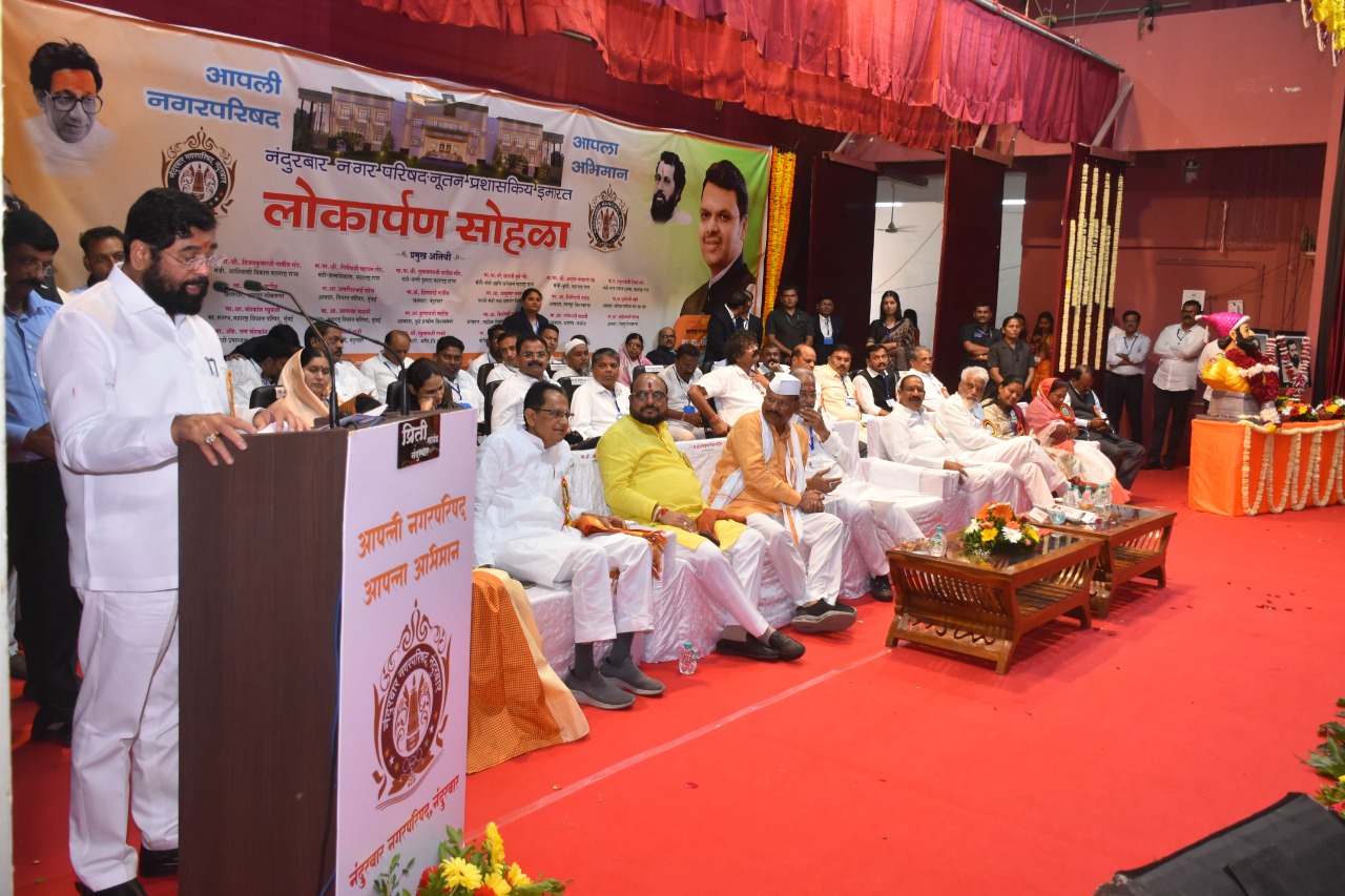 मुख्यमंत्री शिंदे म्हणाले की, आदिवासी समाजासाठी अर्थसंकल्पात भरघोस निधीची तरतूद केली आहे. राज्यातील विकास कामांना गती व चालना देण्याचे काम हे सरकार करीत असून हे सरकार आदिवासी, शेतकरी, कष्टकरी, कामगार, वंचित- शोषित अशा सगळ्यांच्या सर्वांगीण विकासासाठी प्रयत्नशील असल्याचे त्यांनी सांगितले. सर्व समाजाच्या सर्वांगीण विकासासाठी गत चार महिन्यात 400 पेक्षा अधिक शासन निर्णय काढले असल्याचे त्यांनी सांगितले. राज्यातील तरुणांना रोजगार देण्यासाठी राज्यात मोठे उद्योगधंदे येण्याकरिता शासन प्रयत्नशील आहे. नंदुरबार शहरातील रस्ते,पथदिवे,पाणीपुरवठातसेच विविध विकासकामासाठी नगरोत्थान योजनेतून निधी उपलब्ध करुन देण्यात येईल तसेच नवापूर मधील 132 के.व्ही विद्युत उपकेंद्रासाठी एमआयडीसीमध्ये जागा उपलब्ध करुन देण्यात येईल. नंदुरबार नगर परिषदेची नूतन इमारत अतिशय सुंदर आणि सुसज्ज असून नागरिकांना त्याचा लाभ होईल, असा विश्वास यावेळी त्यांनी व्यक्त केला.