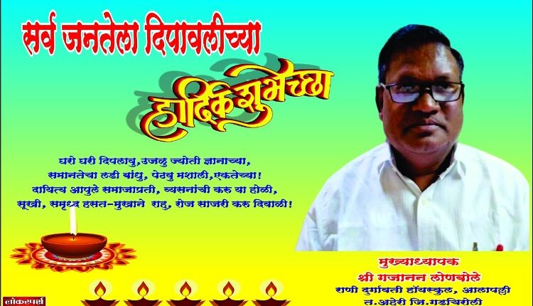 मुख्याध्यापक श्री गजानन लोणबोले, राणी दुर्गावती हायस्कूल आलापल्ली यांच्याकडून सर्व जनतेला दिपावलीच्या हार्दिक शुभेच्छा