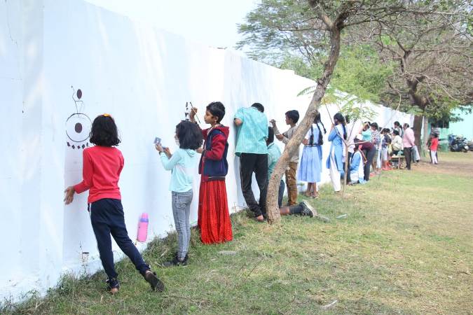 त्यानंतर अॅक्रेलिक पेंट व ब्रशच्या साहाय्याने वारली चित्रे रंगवायला सुरुवात केली. वारली आदिवासी संस्कृतीची ठळक वैशिष्ट्ये असलेल्या झोपड्या, ताडीचे व इतर वृक्ष, वाघ, हत्ती, हरणासारखे प्राणी, कोंबडे, चिमणी व इतर पक्षी, घोड्यावर निघालेली वरात, जात्यावर दळणारी स्त्री, सामूहिक रेला नृत्य, वाद्य वादन करणारा पुरुष अशा अनेक रेखाकृती काढून त्या रंगविल्या. जवळपास तीन ते चार तास विद्यार्थी शाळेच्या भिंतींवर वारली चित्रे काढण्यात मग्न झाले होते.