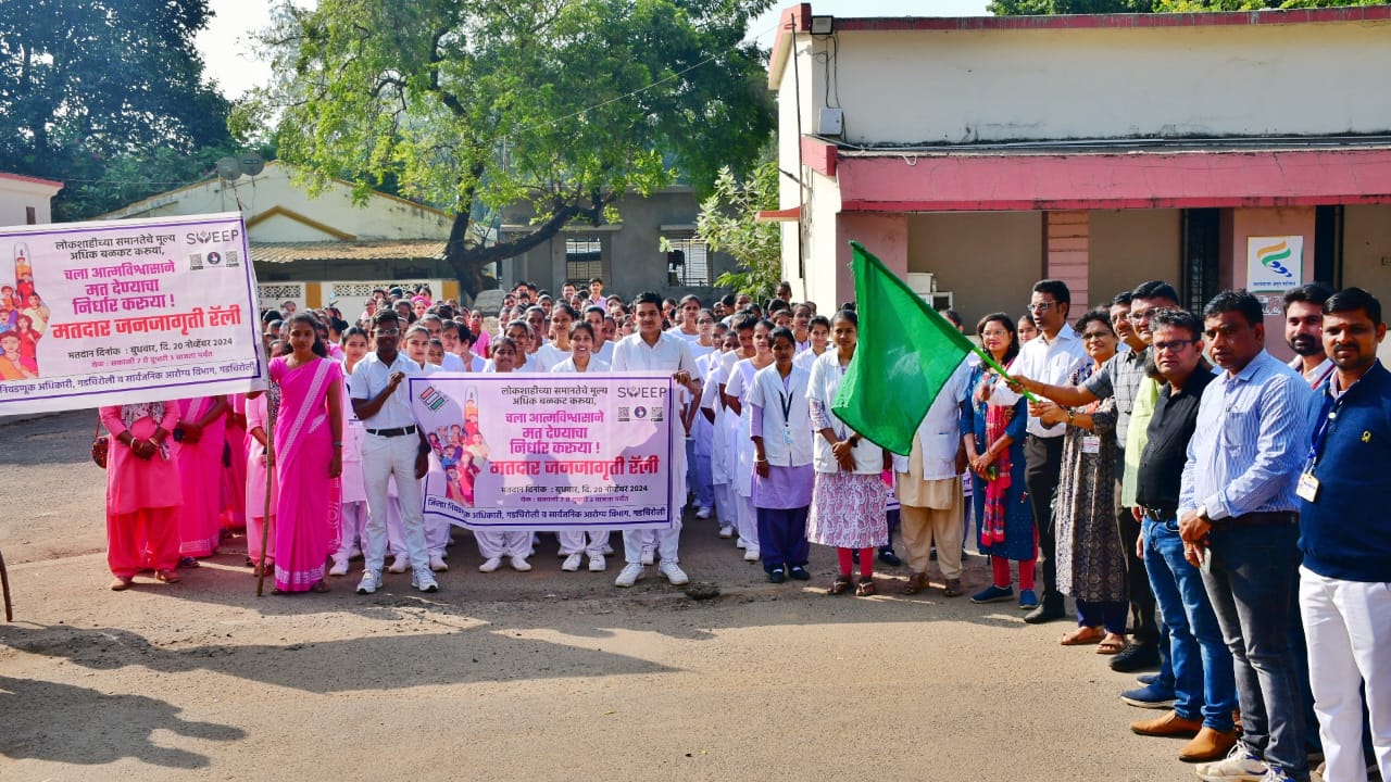 गडचिरोली दि. १३,  विधानसभा सार्वत्रिक निवडणुक 2024 मतदान जनजागृती कार्यक्रम अंतर्गत आरोग्य विभाग गडचिरोली यांच्या वतीने श्री संजय दैने जिल्हाधिकारी गडचिरोली व आयुषी सिंह मुख्य कार्यकारी अधिकारी जिल्हा परिषद गडचिरोली यांच्या मार्गदर्शनाखाली मतदान जनजागृती रॅली चे आयोजन दिनांक 13/11/2024 ला इंदिरा गांधी चौक गडचिरोली येथे करण्यात आले .त्यानंतर महिला व बाल रुग्णालय येथे मतदान प्रतिज्ञा घेण्यात आली.