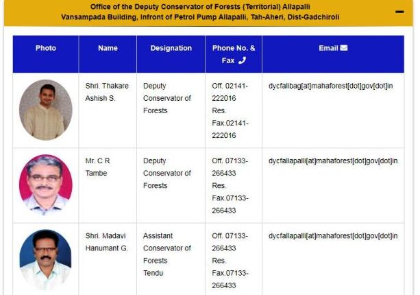 भामरागड वनविभागाचे उपवनसंरक्षक म्हणून सिद्धेश सावर्डेकर यांची बदली होऊन बराच कालावधी लोटून गेला तरी यांचे नाव व छायाचित्र आजही संकेतस्थळावर कायम आहे. त्याचप्रमाणे सहाय्यक वनसंरक्षक (प्रोबेशनरी) म्हणून नितेश देवगडे यांचे नाव व छायाचित्र आजही संकेतस्थळावर कायम आहे. जेव्हा की, ते आलापल्ली वनविभागात उपविभागीय वनाधिकारी म्हणून कार्यरत आहेत. त्यामुळे संपर्क या श्रेणीत अधिकाऱ्यांची माहिती शोधली असता परिपूर्ण माहिती उपलब्ध नाही.