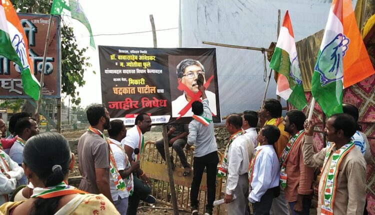 घुग्घूस, दि. ११ डिसेंबर : भारतीय जनता पक्षाचे नेते राज्याचे उच्च व तंत्रशिक्षण मंत्री चंद्रकांत पाटील यांनी डॉ.बाबासाहेब आंबेडकर, महात्मा ज्योतिबा फुले,कर्मवीर भाऊराव पाटील यांनी भीक मागून शाळा काढल्या असा थोर महापुरुषांचा अपमान करणारा वक्तव्य केल्याने संपुर्ण संतप्त काँग्रेस कार्यकर्त्यांनी 11 डिसेंबर रोजी दुपारी 12 वाजता छत्रपती शिवाजी चौक येथे निरदर्शने करुन चंद्रकांत पाटलांच्या प्रतिमेस जोडे मारून चंद्रकांत पाटील मुर्दाबादच्या घोषणा देत निषेध व्यक्त केला.