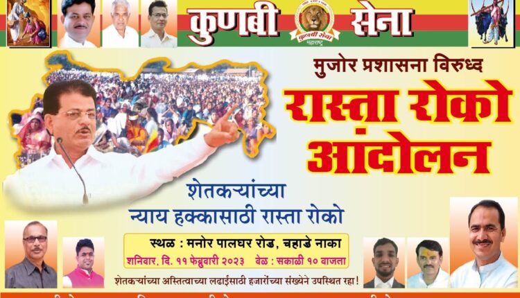 शेतकऱ्यांनी कुणबी सेनाप्रमुख मा. विश्वनाथ पाटीलसाहेब, जिल्हाप्रमुख अविनाश पाटील यांच्या नेतृत्वाखाली शनिवार दि.११/०२/२०२३ रोजी मनोर – पालघर राज्य महामार्गावरील “चहाडे नाका” या ठिकाणी रास्ता रोको आंदोलन करण्याचा निर्णय घेतला आहे. त्यामुळे जनतेला होणाऱ्या संभाव्य त्रासाला शासनाचे प्रशासन जबाबदार राहील असा इशारा कुणबी सेनेच्या वतीने देण्यात आला आहे.
