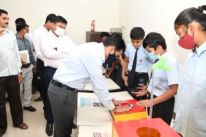 गडचिरोली, दि. २८ फेब्रुवारी : राष्ट्रीय विज्ञान दिनानिमित्त विद्यार्थ्यांमधील विज्ञान विषयक सुप्त कल्पनांना व्यासपीठ मिळावे याद्रुष्टीने जवाहरलाल नेहरू न.प. उच्च प्राथमिक शाळा रामनगर येथे विज्ञान प्रदर्शन आयोजित करण्यात आले. विज्ञान प्रदर्शनाचे उद्घाटन संजय मीणा, जिल्हाधिकारी, गडचिरोली यांचे हस्ते करण्यात आले. याप्रसंगी आशिष येरेकर, सहाय्यक जिल्हाधिकारी तथा प्रशासक नगर परिषद गडचिरोली, विशाल वाघ, मुख्य अधिकारी, नगर परिषद गडचिरोली हे उपस्थित होते.