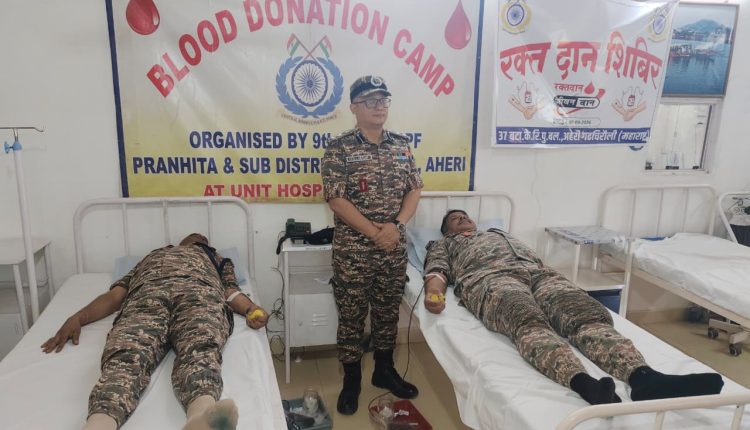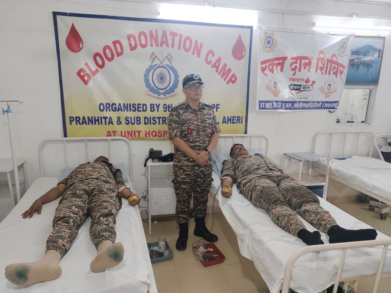 त्यानंतर दिनांक ७ मार्च २०२६ रोजी अहेरी येथील प्राणहिता पोलीस छावणीत ०९ व ३७ बटालियनच्या संयुक्त विद्यमाने रक्तदान शिबिर आयोजित करण्यात आले. या उपक्रमात जवानांसह स्थानिक नागरिकांनीही उत्साहाने रक्तदान करून मानवसेवेची भावना प्रकट केली. उपजिल्हा रुग्णालयाच्या वैद्यकीय पथकाने रक्तसंकलनाची जबाबदारी पार पाडत कार्यक्रम यशस्वी होण्यासाठी सहकार्य केले.
